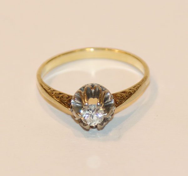 Lot 45: 14 k geprüfter Gelbgold Ring mit Diamant in Weißgoldfassung,...