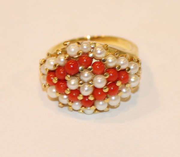 Lot 50: 18 k geprüfter Gelbgold Ring mit Perlchen und Korallenkugeln,...