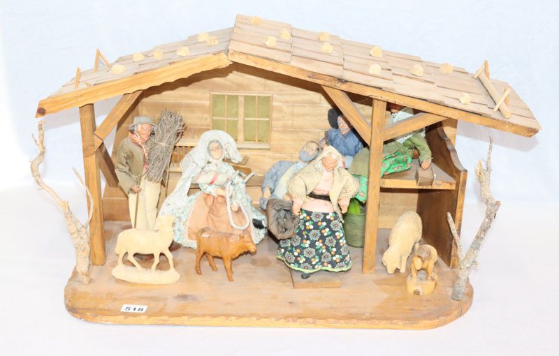 Lot 518: Krippenstall im alpenländischem Stil mit 6 Gußfiguren, Altersspuren,...